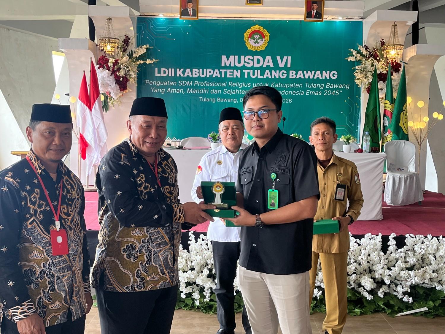 Kasubsi II Intelijen Kejari Tulang Bawang, Gian Apriliansyah (kanan), menerima plakat dari pengurus LDII usai memberikan pengarahan hukum dalam Musda VI DPD LDII Tulang Bawang.