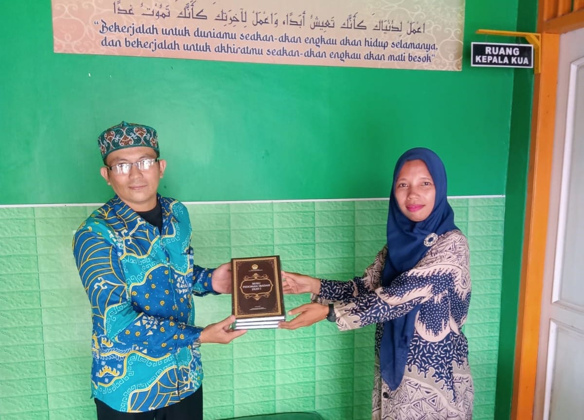 PC LDII Sukabumi, Bandar Lampung menghadiahkan satu paket Buku Pedoman badah LDII saat melakukan kunjungan ke Kantor Urusan Agama (KUA). (Foto: LINES)