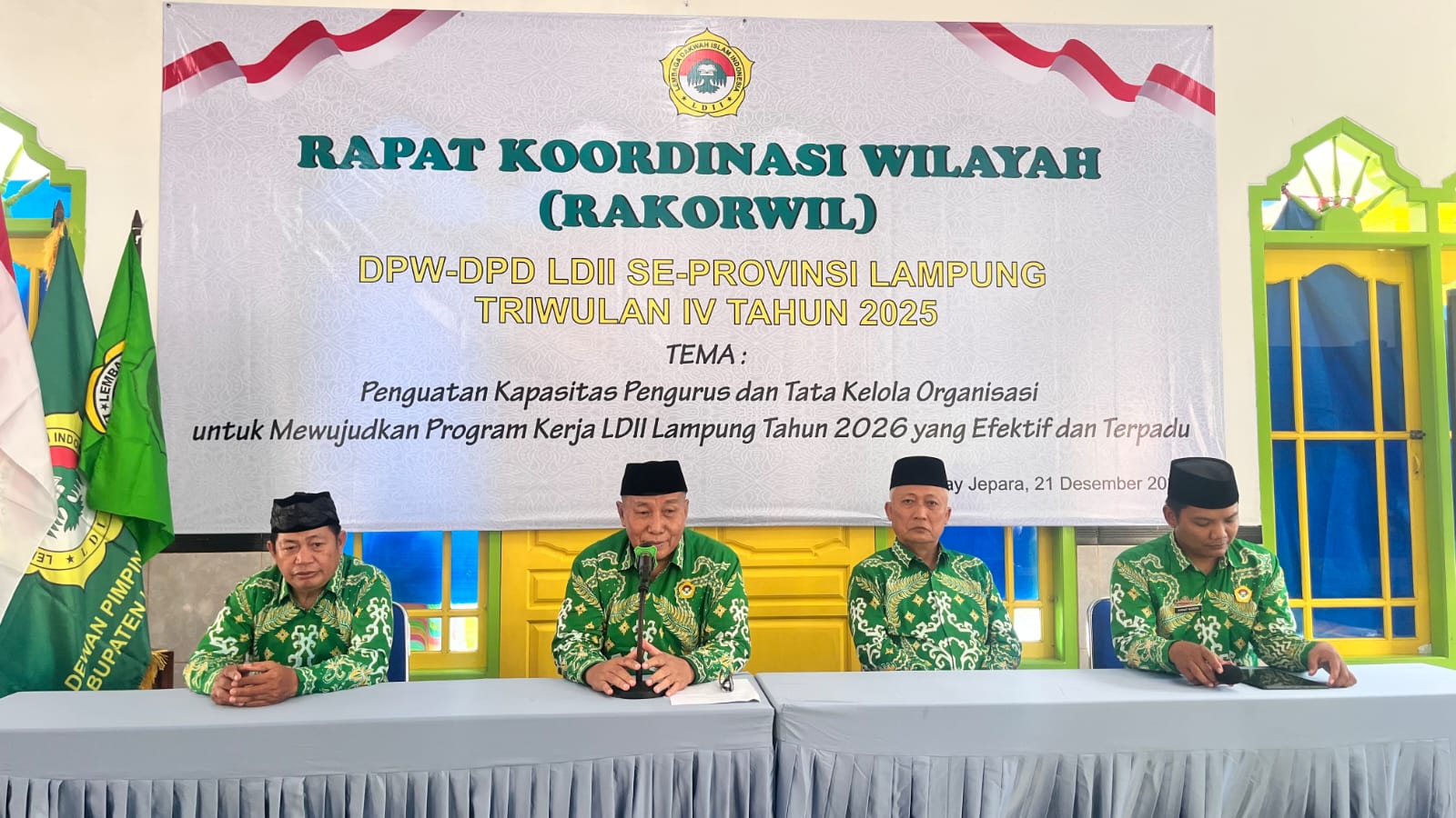 Way Jepara (22/12). Dewan Pimpinan Wilayah Lembaga Dakwah Islam Indonesia (DPW LDII) Provinsi Lampung menggelar Rapat Koordinasi Wilayah (Rakorwil) DPW–DPD LDII se-Provinsi Lampung Triwulan IV Tahun 2025. Kegiatan tersebut berlangsung di Pondok Pesantren Al-Mannar Khamilal Qur’an (Al Haq), Way Jepara, Kabupaten Lampung Timur, pada Minggu (21/12).