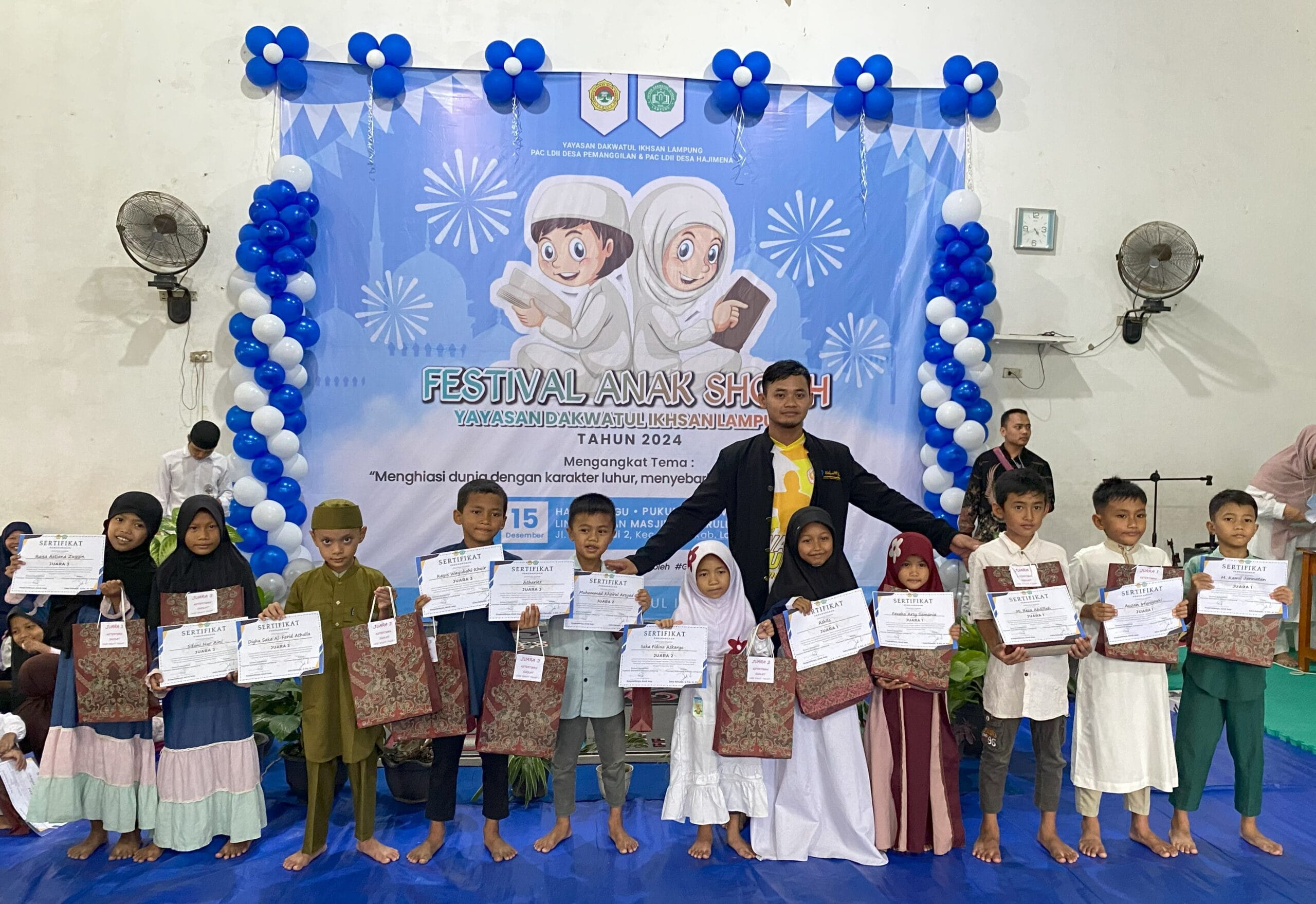 Evaluasi tersebut dikemas dalam bentuk Festival Anak Saleh (FAS) pada Ahad, 15 Desember lalu dengan mengangkat tema “menghiasi dunia dengan karakter luhur, menyebarkan ilmu dengan teknologi”. Bertempat di GSG Syairullah, Desa Pemanggilan, FAS diikuti lebih dari 200 peserta didik mulai dari usia dini hingga remaja yang berasal dari TPA di dua desa tersebut. Berbagai cabang yang difestivalkan antara lain tahfidzul Quran, tafsir Al Quran, hafalan do’a, da’i, adzan, shalat, menulis arab, LCT, dan pencak silat.