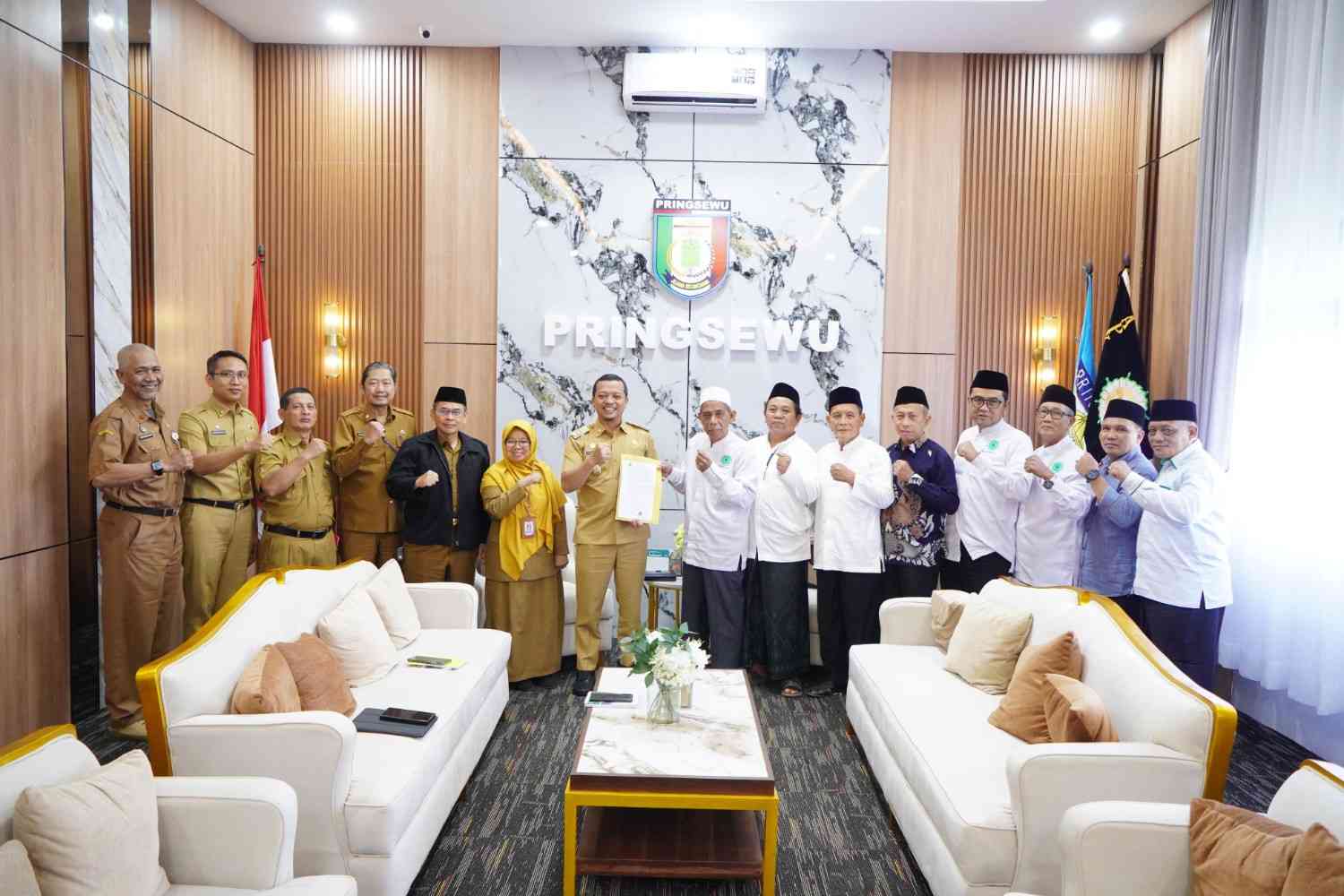 Pringsewu (24/2). Ketua DPD LDII Kabupaten Pringsewu, Dian Arif Rahman, bersama jajaran pengurus harian MUI mendampingi Ketua Umum MUI Kabupaten Pringsewu melakukan audiensi dengan Bupati Pringsewu, Riyanto Pamungkas, pada Selasa (24/2). Audiensi tersebut membahas pelaksanaan program Makan Bergizi Gratis (MBG) selama bulan Ramadan agar tetap berjalan optimal tanpa mengganggu kekhusyukan ibadah puasa para siswa dan santri.