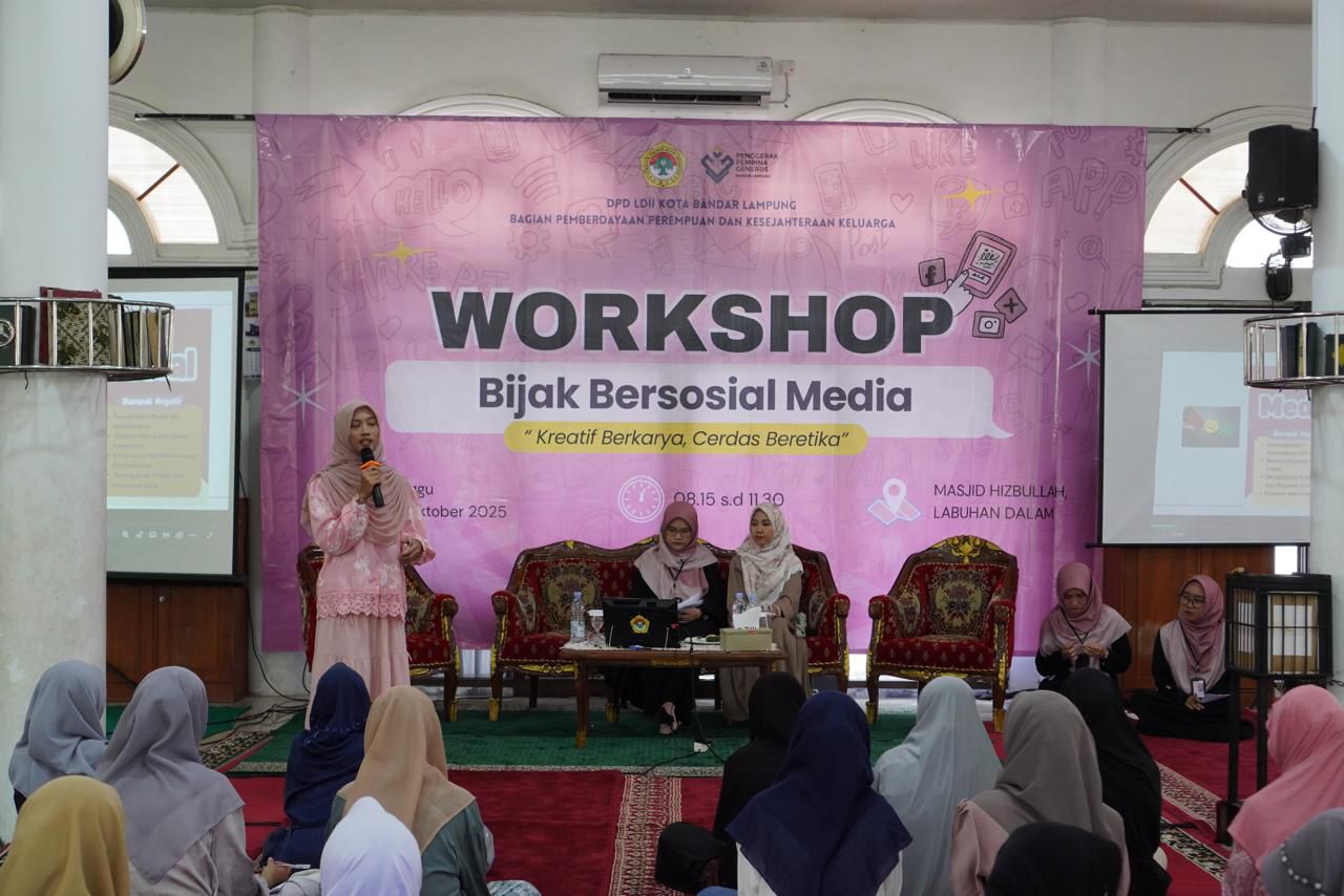 Bandar Lampung (28/10). Di tengah derasnya arus informasi dan perkembangan dunia digital, Bagian Pemberdayaan Perempuan dan Kesejahteraan Keluarga (PPKK) DPD LDII Kota Bandar Lampung mengambil langkah nyata dengan menggelar Workshop bertema “Bijak Bersosial Media, Kreatif Berkarya, Cerdas Beretika”. Kegiatan ini berlangsung pada Minggu, (26/10) di Masjid Hisbullah, Labuhan Dalam, dan diikuti oleh lebih dari 300 generus putri jenjang SMP hingga SMA.