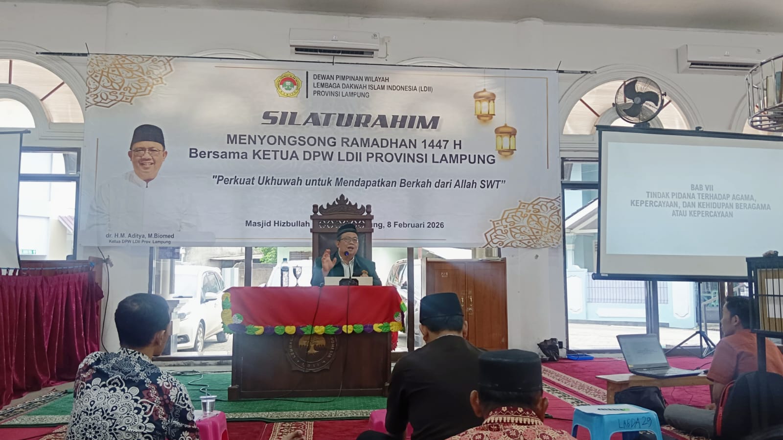 Ketua DPW LDII Provinsi Lampung, M. Aditya, saat memberikan materi terkait kesadaran hukum dan wawasan kebangsaan dalam acara Silaturahim Menyongsong Ramadan 1447 H di Masjid Hisbullah, Bandar Lampung, Minggu (8/2).